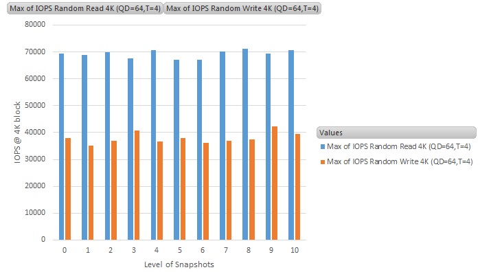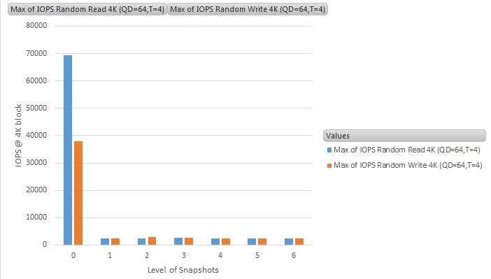 The Y-axis is the throughput results in IOPS (Input-output per second), and the X-axis is the number of snapshots running on the VM (0 means no snapshot - i.e., the baseline figure)