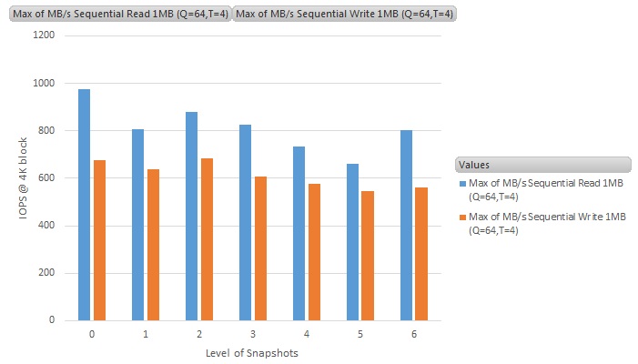 The same CrystalMark benchmark test was cycled 6 times on the NFS datastores (and 10 times on VVOLs datastores), from the baseline of no snapshot, to 6 levels (or 10 levels on VVOLS) deep of snapshots.